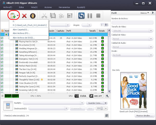 Hacer clic en el boton "Añadir Archivo(s)" en la barra de herramientas o seleccionar "Archivo> Abrir DVD" en el menú principal para cargar DVD.