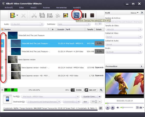 Después de seleccionado el perfil de salida, tu solamente necesitas revisar los archivos que deseas convertir en la lista de archivos y hacer clic en el boton "Convertir Elemento(s) Marcado(s)" en la barra de herramientas para completar la tarea.